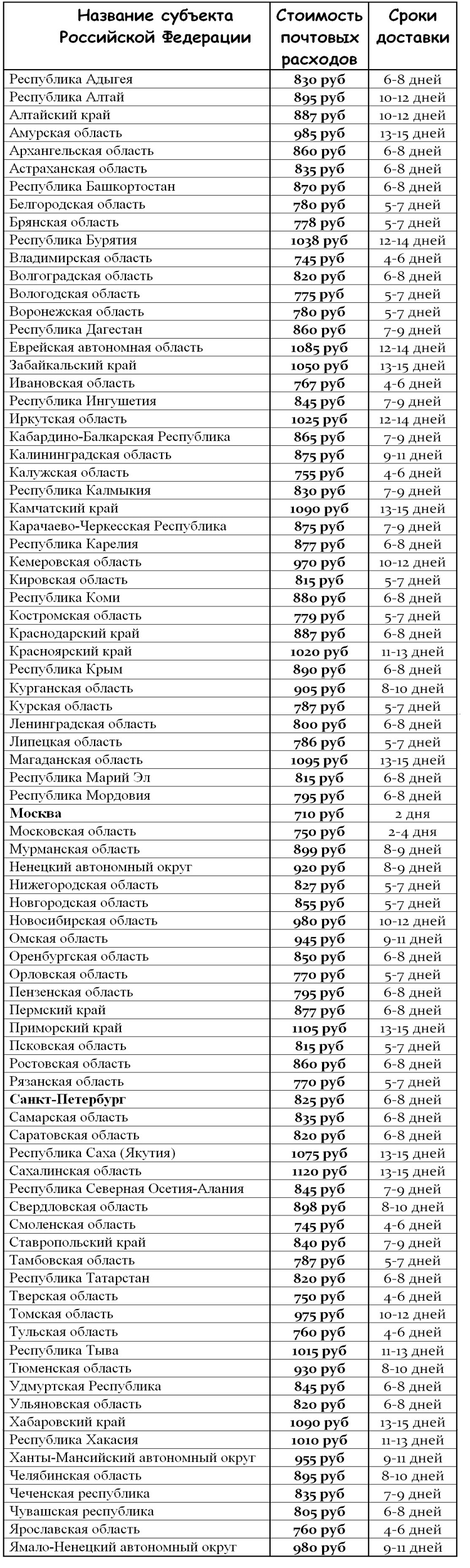 Почтовые расходы зависят от Вашего региона доставки, смотрите в таблице ниже.